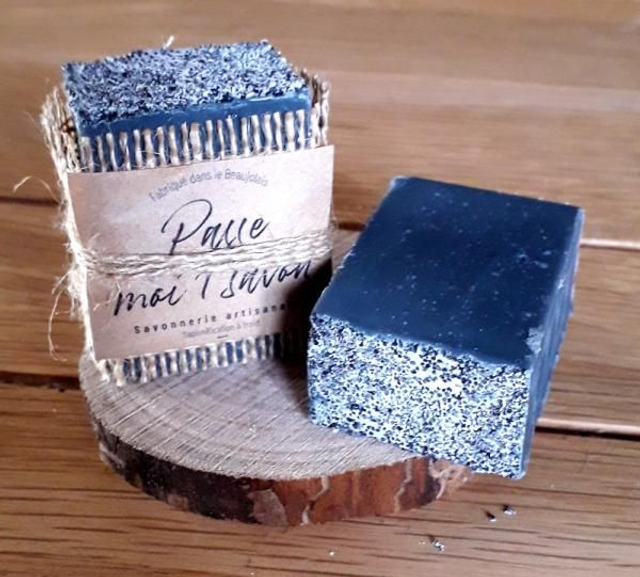 Au charbon végétal, et incrustation de graines de pavot, exfoliant tonique.