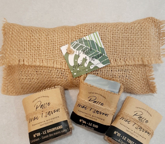 Cette pochette en jute contient 3 p'tits savons de 50g,